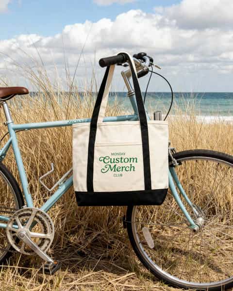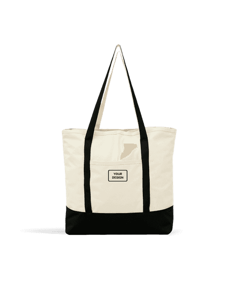 A two-tone canvas tote with a contrasting base and handles. The exterior slip pocket adds function, and the contrast colors make your logo stand out naturally.
