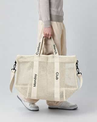A lightweight mesh tote with an open weave and branded straps. It is spacious and breathable, making it ideal for summer events or casual use, and your logo can be added for personalized branding.