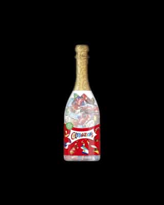 Una botella transparente reutilizable llena de dulces variados para celebrar. Perfecta para regalar, eventos o obsequios corporativos en la temporada navideña.