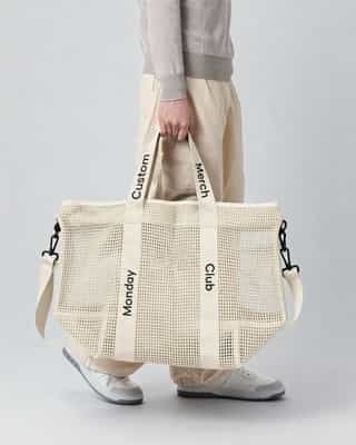 Een lichtgewicht mesh shopper met een open weefsel en merkbanden. Hij is ruim en ademend, waardoor hij ideaal is voor zomerevenementen of casual gebruik, en jouw logo kan worden toegevoegd voor een gepersonaliseerde merkuitstraling.